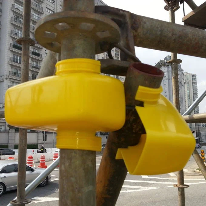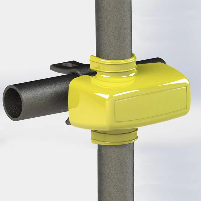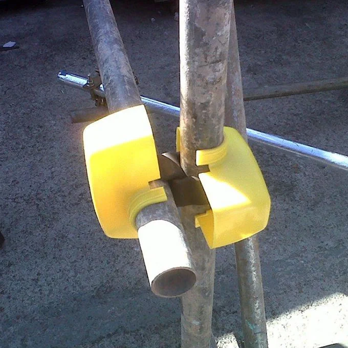 Capa de proteção para abraçadeiras de andaimes fabricada com uso de 100% Polipropileno (PP). Espessura das paredes da proteção de 3 / 5 mm para permitir que a capa de proteção seja um produto não descartável, pois tem possibilidade de ser usado para mais de uma obra. Fabricada na cor padrão amarelo segurança mas com a possibilidade de personalizá-la com outras cores.