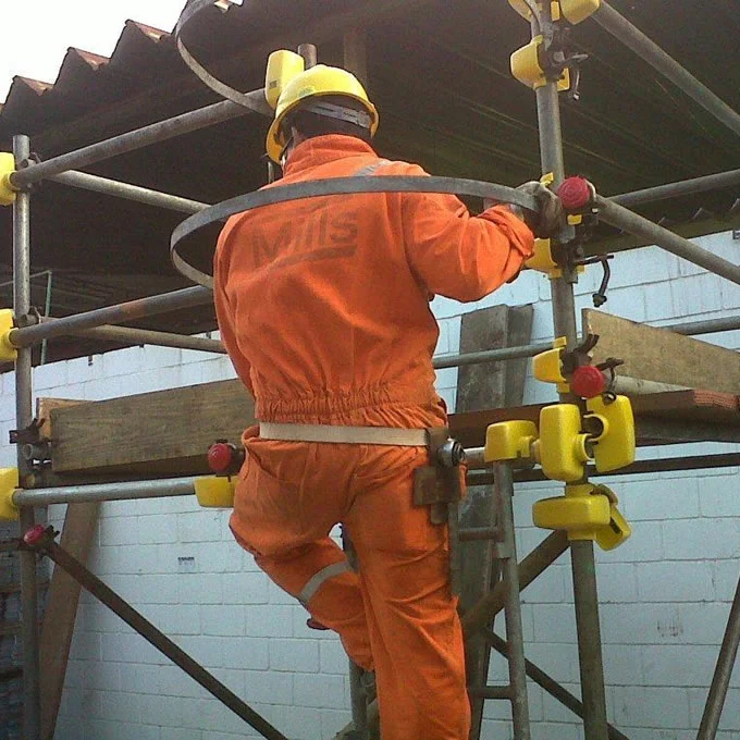 Fabricada com adicionamento de aditivos: a) para ser imune à radiação solar por meio de nosso tratamento anti – UV, b) para ser imune a maresia, c) flexível para amortecer as batidas de ferramentas e o corpo do trabalhador, d) para ter uma excelente resistência química à maioria dos ácidos, e) para ter uma excelente resistência a temperaturas até 135º C, f) completamente atóxica. Fixação ao tubo do andaime com sistema de engate e desengate de fácil operação.